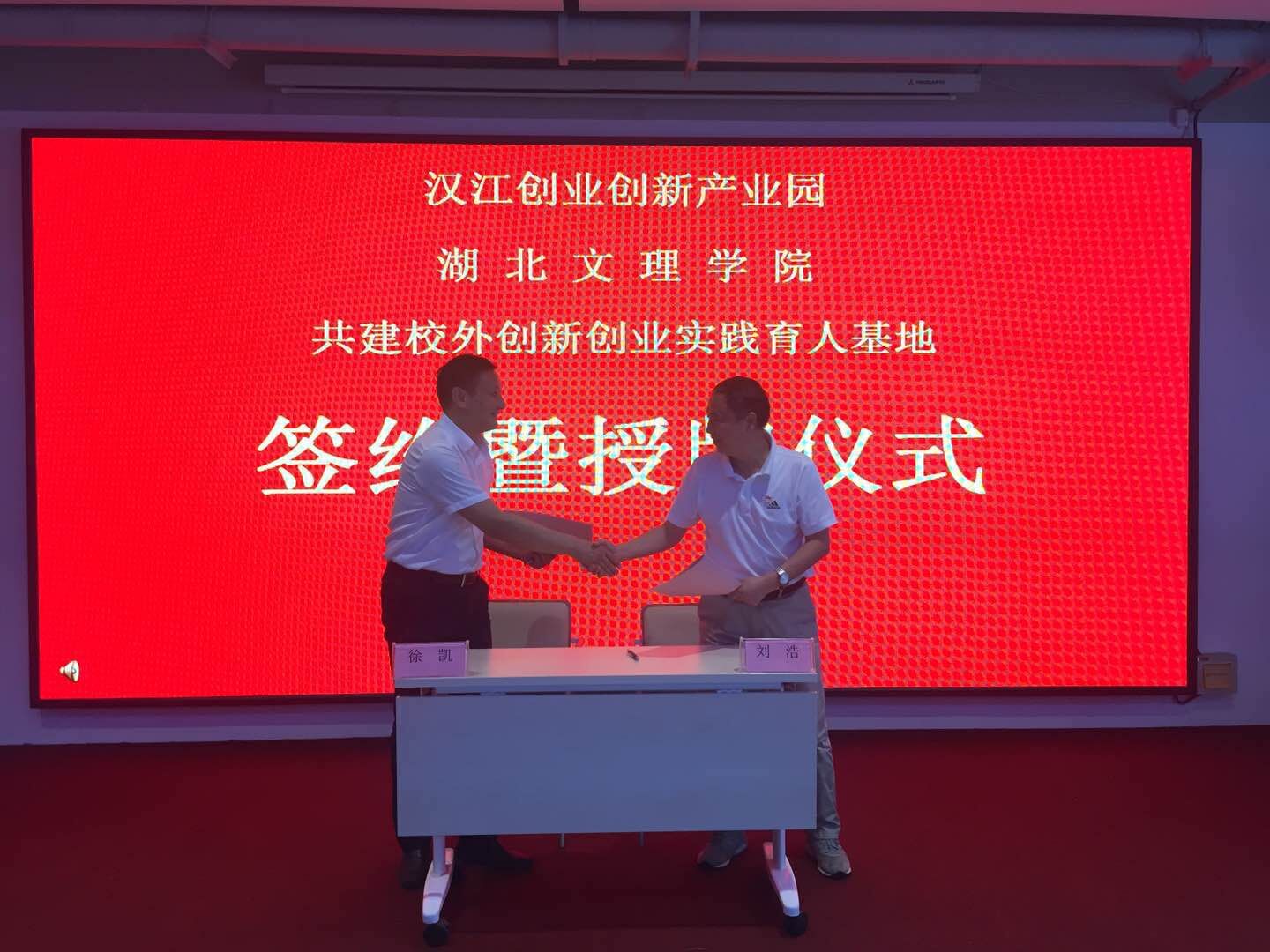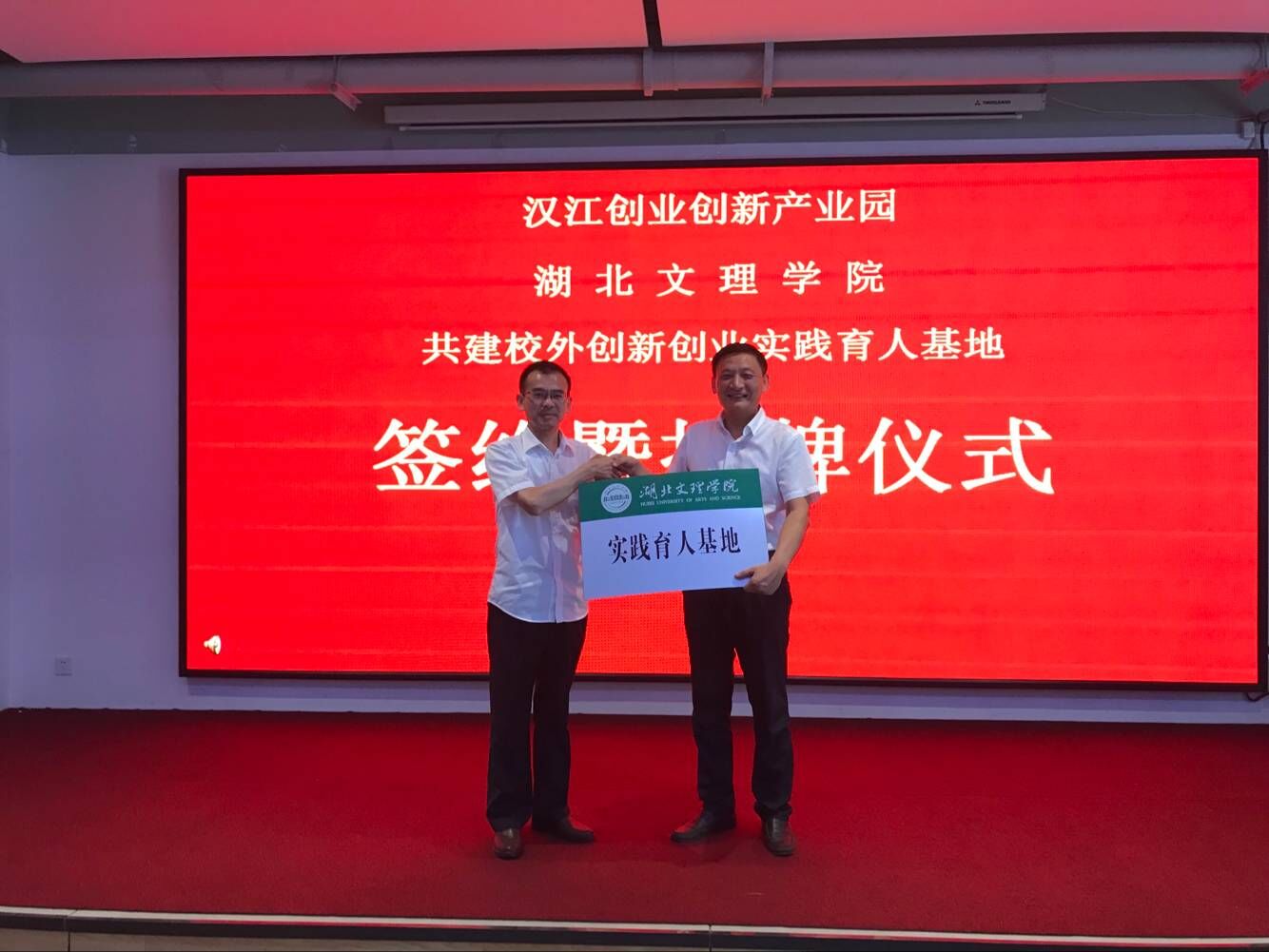 在园区企业负责人、师生代表的见证下,刘浩代表学校与汉江创业创新产业园总经理徐凯签订共建校外实践育人基地协议。之后,周建修代表学校为汉江创业创新产业园校外实践育人基地授牌。