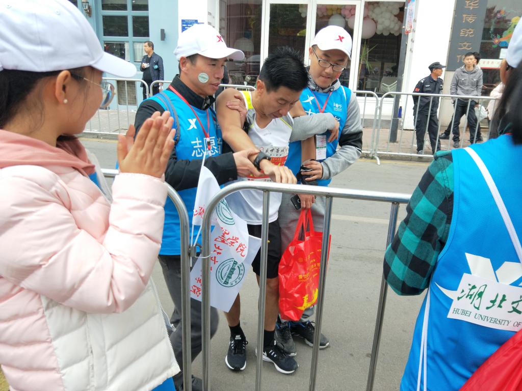 肖氏武是本次各院带队老师中,唯一一个班主任老师。不论是前期的培训还是在比赛期间,他的细心、严谨、认真给志愿者们留下了深刻的印象。严格的考勤制度,确保每一位志愿者的人身安全、准时到位,周到有序的安排,确立饮水站和收容车小分队的组长责任人,耐心向志愿者们讲解志愿精神、服务态度以及重点注意事项。比赛过程中,有一位运动员刚抵达终点,小腿突发抽搐而站立不稳,肖氏武见情况不妙,连忙上前搀扶,并安排志愿者向专业医务人员寻求帮助,在工作人员的共同努力下,运动员逐渐恢复了正常。他在QQ空间中写到:“你们的微笑,你们的掌声,你们的点赞,你们递上的温情一杯水,让全马完赛的跑着感到温馨,谢谢了,可爱的志愿者们!”相信肖氏武的全程陪同和指导,也让数统志愿者们收获满满!