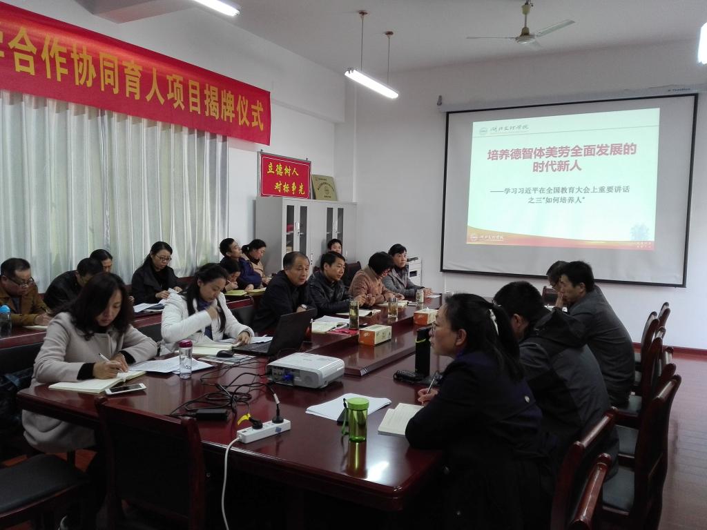 会上,党委副书记姚威领学了《培养德智体美劳全面发展的时代新人》—学习习近平在全国教育大会上的重要讲话之三“如何培养人”;领学了《中华人民共和国监察法》;领学了《中国共产党纪律处分条例》;副院长丁凌领学了习近平总书记关于勤俭节约的重要论述;院长助理张旻嵩领学了《湖北文理学院关于开展“弘扬爱国奋斗精神、建功立业新时代”活动的实施方案》。