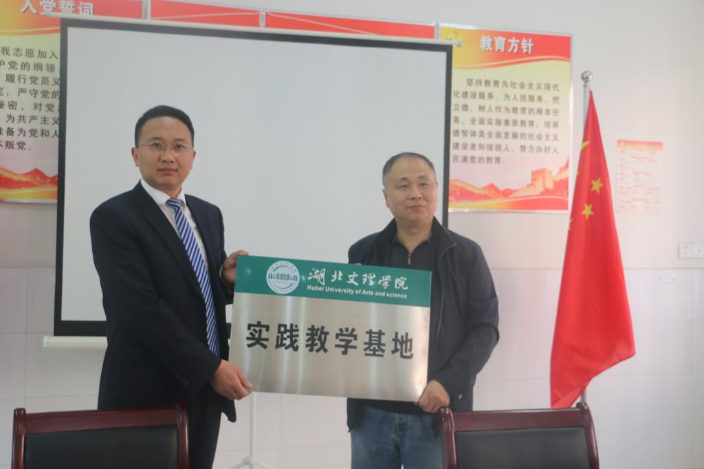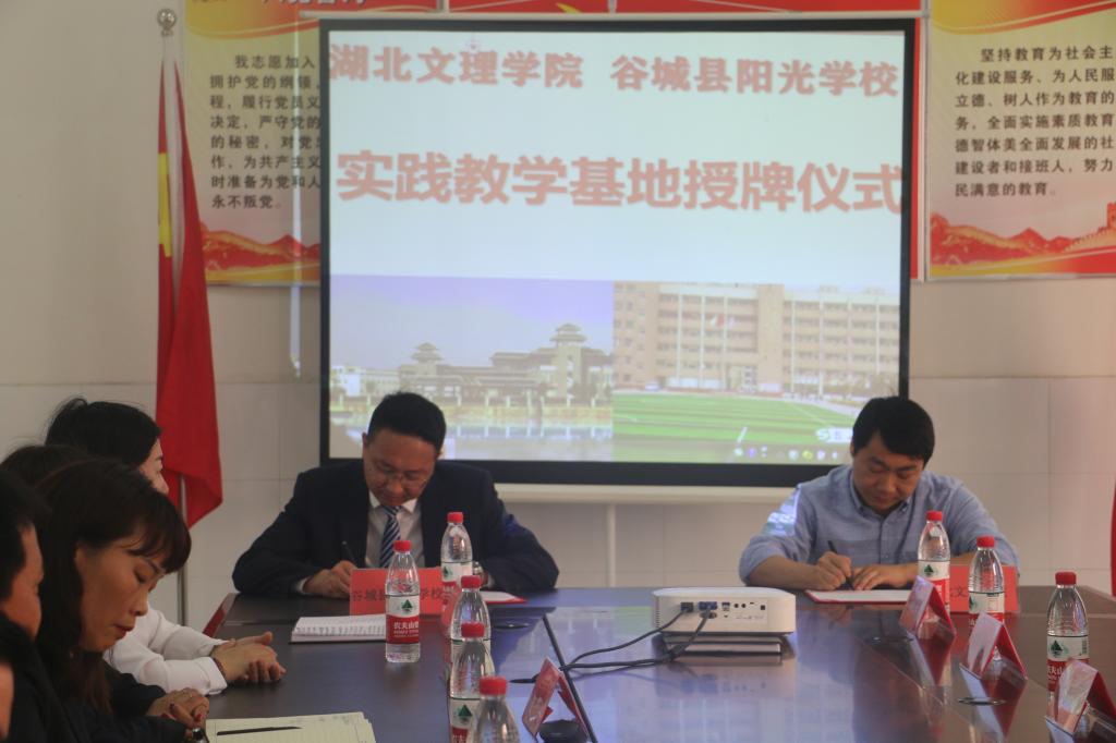 王成勇代表学院与谷城阳光学校签订实践教学基地协议;刘浩代表学院向谷城阳光学校实践教学基地授牌。