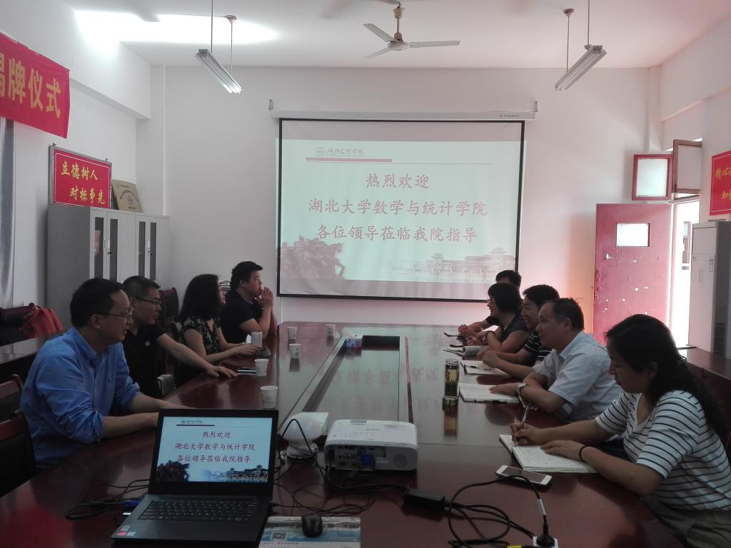 万路路、曾祥勇一行还就我院承办2019年湖北省省属高校数学发展研讨会,2020年主办国家自然科学非线性泛函分析及其应用天元数学专题讲习班等学术交流会议以及党建工作、师资队伍建设交流了经验和做法。
