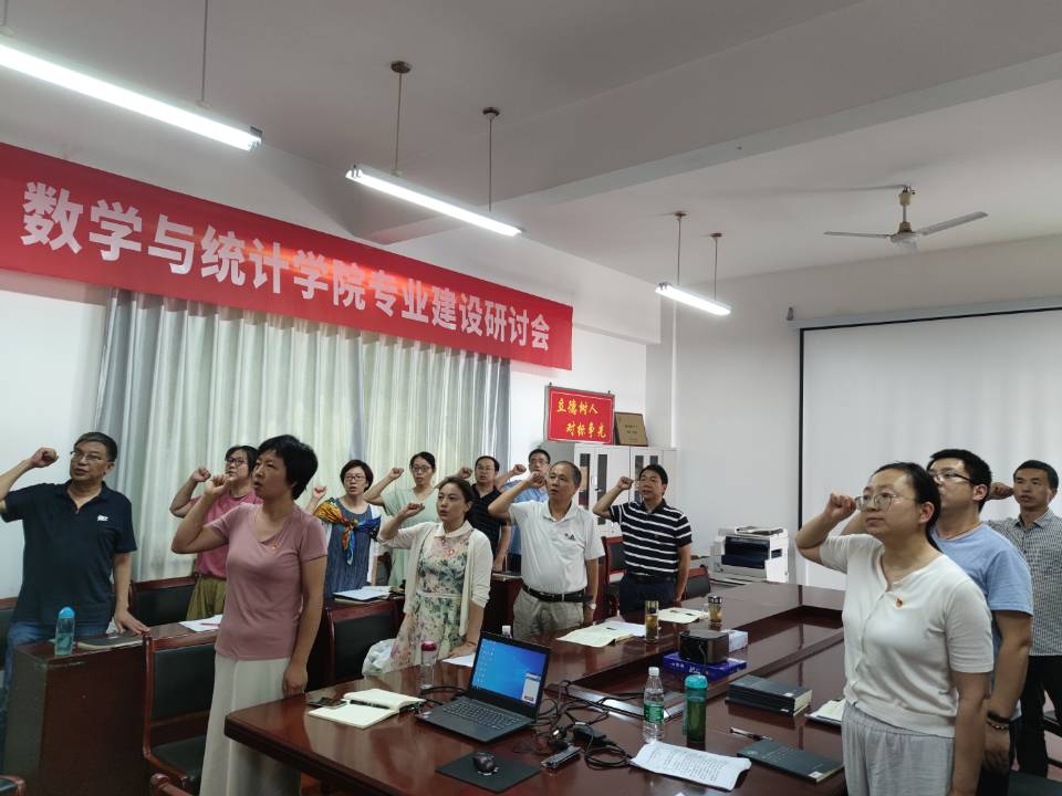 主题党日活动按照“回顾初心、党性教育、民主议事、实践锻炼”四个板块要求进行,全体党员首先在学院会议室集中进行奏唱国歌、重温入党誓词两项议程。议程由信息与计算科学系教师党支部书记唐波主持,数学与应用数学系教师党支部书记杨艳领誓。