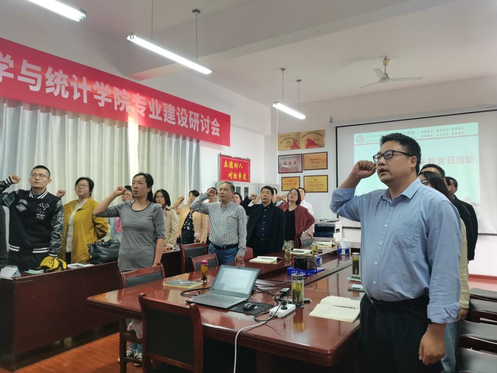 主题党日按照“回顾初心、党性教育、民主议事、实践锻炼”四个板块要求进行,全体党员首先在学院会议室集中进行奏唱国歌、重温入党誓词两项议程,由数学与应用数学系教师党支部书记杨艳主持、信息与计算科学系教师党支部书记陶茂虎领誓。