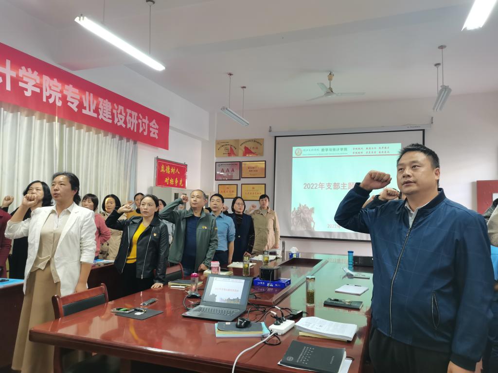 主题党日按照“回顾初心、党性教育、民主议事、实践锻炼”四个板块要求进行,全体党员首先在学院会议室集中进行奏唱国歌、重温入党誓词两项议程,由信息与计算科学系教师党支部书记陶茂虎主持、数学与应用数学系教师党支部书记杨艳领誓。