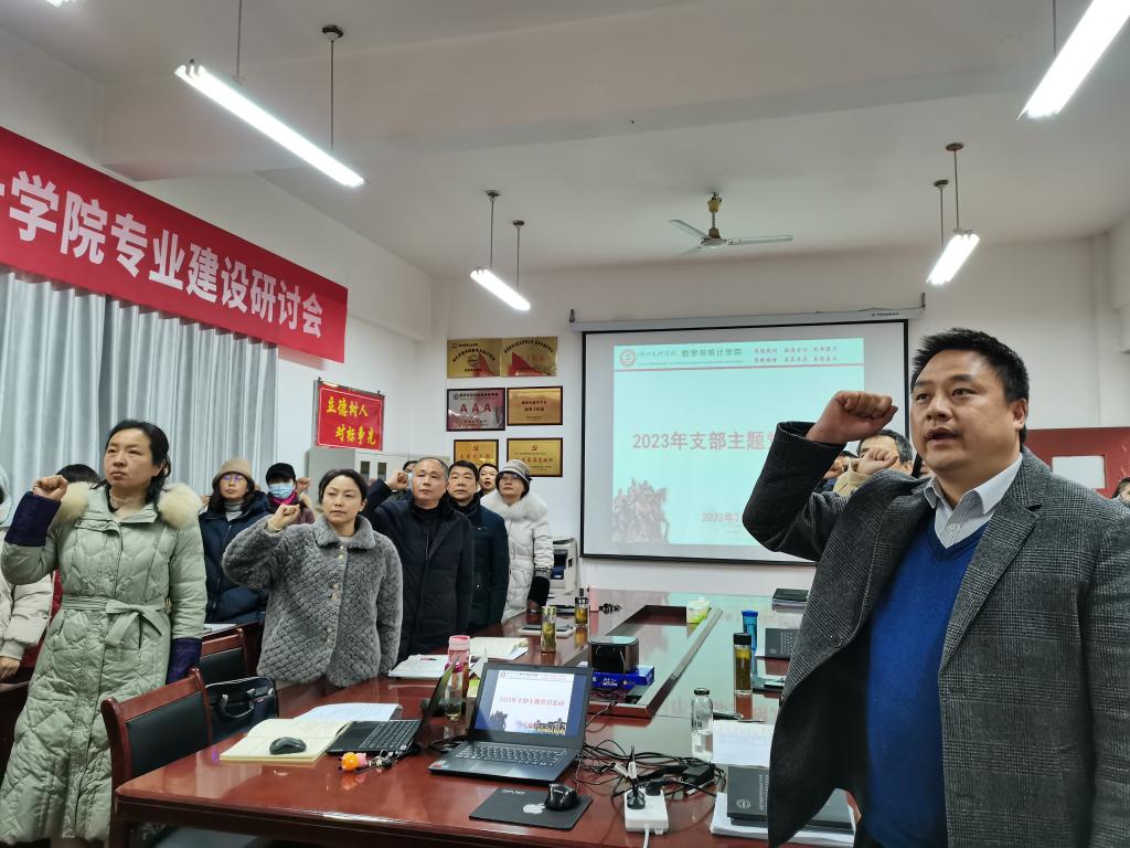 主题党日按照“回顾初心、党性教育、民主议事、实践锻炼”四个板块要求进行,全体党员首先在学院会议室集中进行奏唱国歌、重温入党誓词两项议程。主题党日由数学与应用数学系教师党支部书记杨艳主持、信息与计算科学系教师党支部书记陶茂虎领誓。
