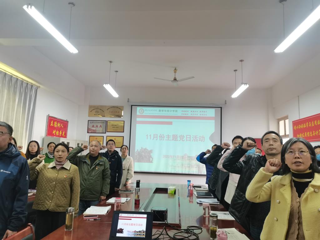 主题党日按照“回顾初心、党性教育、民主议事、实践锻炼”四个板块要求进行,全体党员首先在学院会议室集中进行奏唱国歌、重温入党誓词两项议程,由信息与计算科学系教师党支部书记陶茂虎主持、数学与应用数学系教师党支部书记张敏捷领誓。