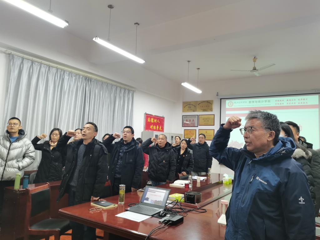 主题党日按照“回顾初心、党性教育、民主议事、实践锻炼”四个板块要求进行,全体党员首先在学院会议室集中进行奏唱国歌、重温入党誓词两项议程,由信息与计算科学系教师党支部书记陶茂虎主持、数学与应用数学系教师党支部书记张敏捷领誓。