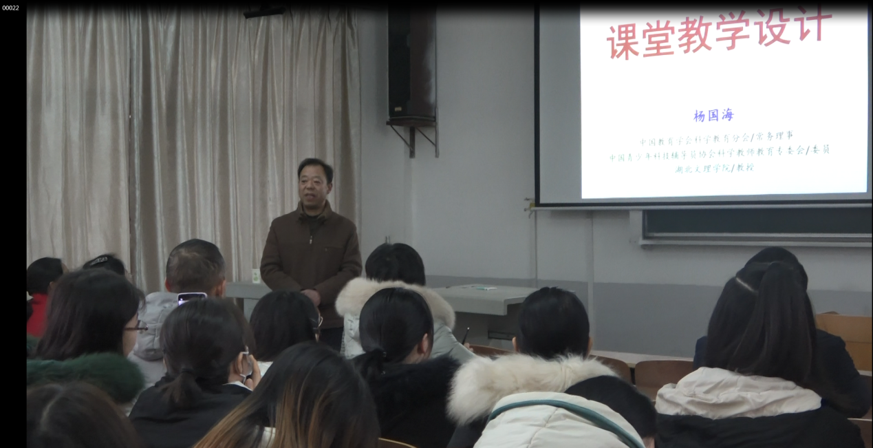 课堂教学能力提升专题讲座----《课堂教学设计》由湖北文理学院物理与电子工程学院杨国海教授主讲。杨国海教授专门从事基础教育课程、教学与评价和科学与技术教育的研究。杨教授主要围绕课堂教学的意涵、教学设计的理论基础、教学设计程序以及课堂教学方案的编写四个方面阐述了课堂教学设计。