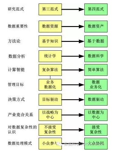 2007年,图灵奖获得者Jim Gray提出了科学研究的第四范式——数据密集型科学发现(Data-intensive ScientificDiscovery)。在他看来,人类科学研究活动已经历过三中不同范式的演变过程(原始社会的“实验科学范式”、以模型和归纳为特征的“理论科学范式”和以模拟仿真为特征的“计算科学范式”),目前正在从“计算科学范式”转向“数据密集型科学发现范式”。
