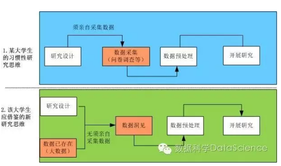 第四范式,即“数据密集型科学发现范式”的主要特点是科学研究人员只需要从大数据中查找和挖掘所需要的信息和知识,无须直接面对所研究的物理对象。例如,在大数据时代,天文学家的研究方式发生了新的变化——其主要研究任务变为从海量数据库中发现所需的物体或现象的照片,而不再需要亲自进行太空拍照。再如,本书作者在一次研究生科学研究方法的调研中发现,绝大部分同学的研究范式有待调整——他们往往习惯性地“采用问卷调查法等方法亲自收集新数据”,而不是“首先想到有没有现成的大数据以及如何再利用已有的数据(数据洞见)”,如图1所示。